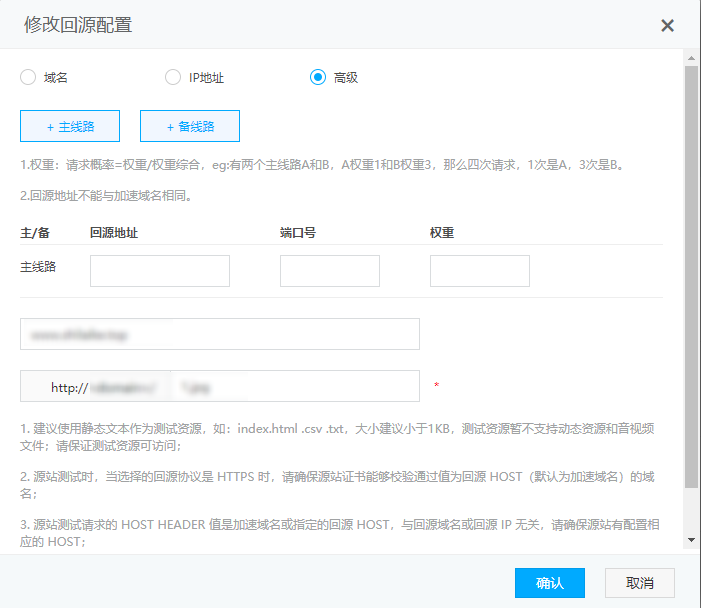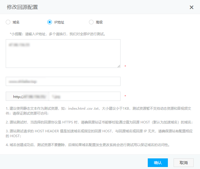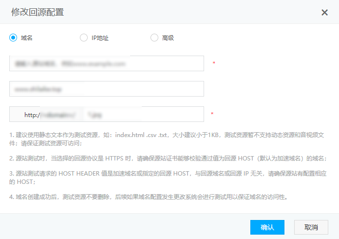 操作说明您可以登录进入控制台选择CDN控,可以在控制台中查看域名的回源配置信息及进行相关配置修改。 登录,进入控制台->CDN->域名管理->配置->回源配置 ![]() 修改配置 域名:设置指定域名作为CDN回源的源站,源站的域名需要与加速域名不一致。 ![]() IP地址:设置IP作为CDN回源的源站,支持配置多个IP;回源采用轮询方式,首次选择配置的第一个IP进行回源,当发现某一源站IP异常时,将跳过此IP并进入惩罚时间,屏蔽5秒 ![]() 高级配置:支持配置多个回源的主备线路,可以是域名或是IP,并支持权重配置。 说明: (1)权重:请求概率=权重/权重总和,eg:有两个主线路A和B,A权重1 和 B权重3,那么四次请求,1次是A,3次是B。 (2)回源地址不能与加速域名相同。 ![]() 回源HOST:是指 CDN 节点在回源过程中,在源站访问的站点域名。即http请求头部的host字段内容,可根据自己的需要修改。 回源HOST默认是加速域名,支持自定义配置。 回源协议:即请求回源的协议,默认为HTTP协议,当开启HTTPS配置时,支持选择回源协议HTTP、HTTPS二种方式。 回源验证:保证源站的高可用,只有源站测试通过才能继续创建域名。 |