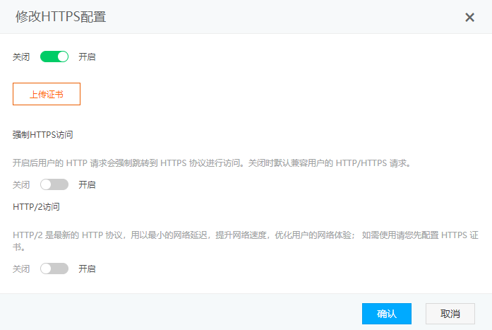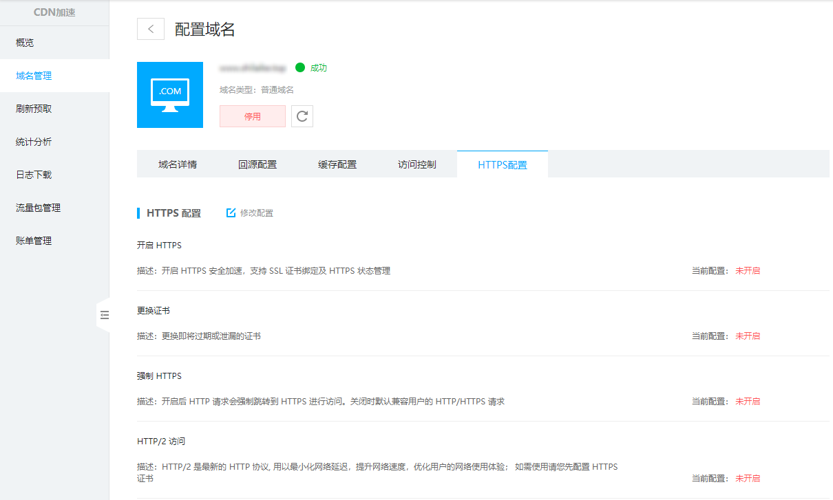 操作说明HTTPS 是指超文本传输安全协议(Hypertext Transfer Protocol Secure,缩写:HTTPS,常称为HTTP over TLS,HTTP over SSL或HTTP Secure)是一种通过计算机网络进行安全通信的传输协议。HTTPS经由HTTP进行通信,但利用SSL/TLS来加密数据包。HTTPS开发的主要目的,是提供对网站服务器的身份认证,保护交换数据的隐私与完整性。配置 HTTPS 时,需要您提供域名对应的证书,实现全网数据加密传输功能。您可以登录控制台选择CDN,进行HTTPS的配置。 登录,进入控制台->CDN->域名管理->配置->域名配置 ![]() 修改配置 ![]()